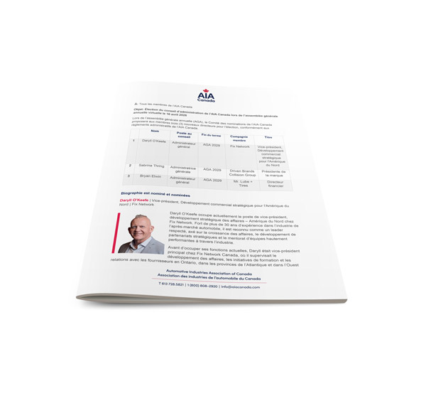 Le rapport du comité de mise en candidature présente les membres proposés pour pourvoir les postes vacants au sein du conseil d’administration de l’AIA Canada. Le rapport de 2026 fournit des biographies des nouveaux membres du conseil Bryan Elwin, Daryll O’Keefe et Sabrina Thring. D’autres changements au conseil sont également présentés.